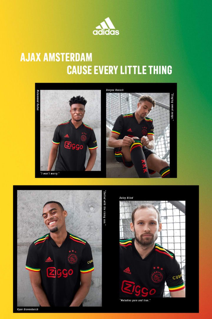 View ajax's video releasing the kit. Introducing our new 21/22 third jersey, inspired by our collective love for @bobmarley and his three little birds. The kit is a tribute to the ajax fans and the love shared by the club and its fans for reggae legend bob marley and his iconic song, three little birds. The kit is a tribute to the ajax fans and the love shared by the club and its fans for reggae legend bob marley and his iconic song, three little birds. Show on footy headlines buy now